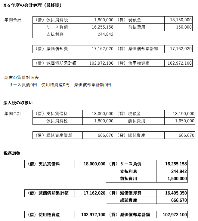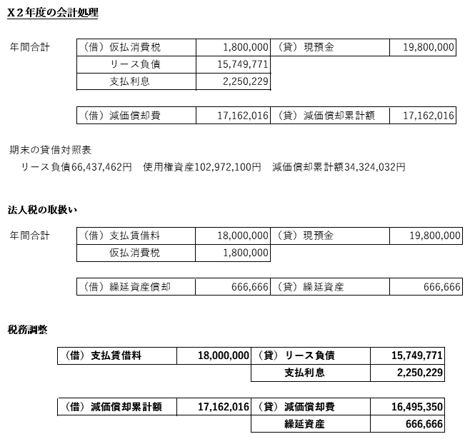このため、会計上の費用(減価償却費+支払利息)と税務上の損金算入額(支払賃借料)に差異が生じ、別表四・五(一)での税務調整が必要となります。
