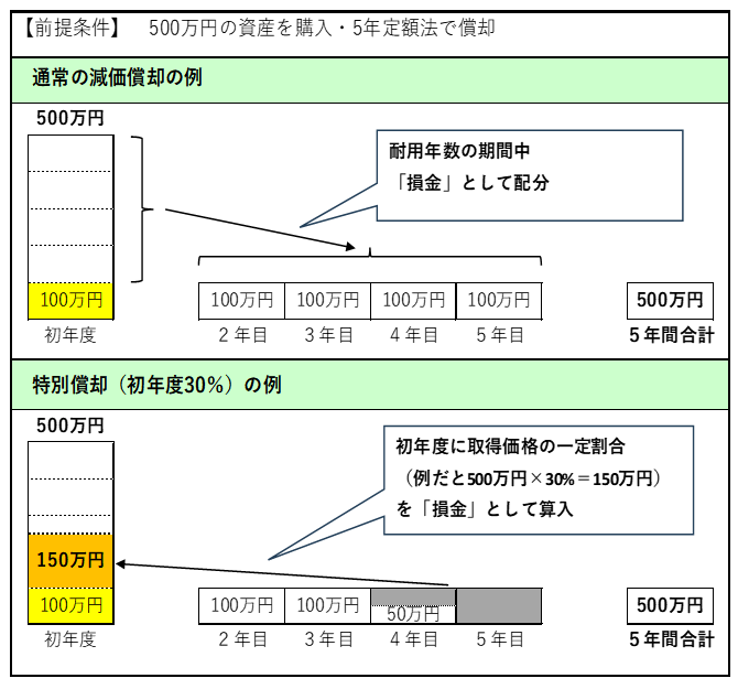 通常の減価償却のみの場合と特別償却を適用する場合の例を図に示します。