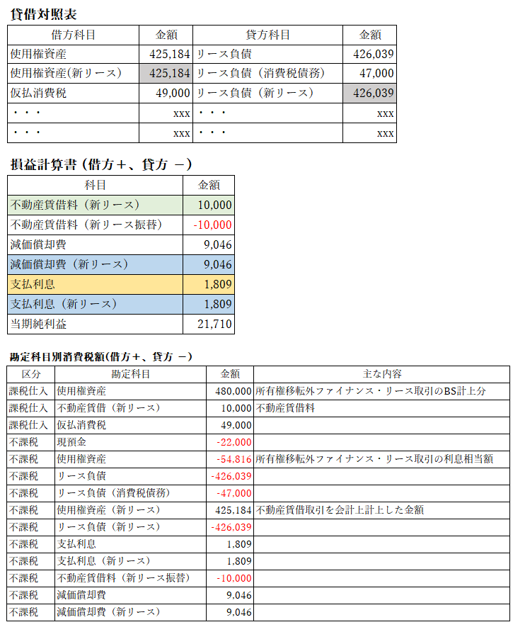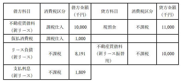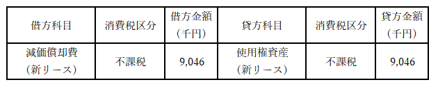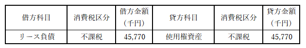 会計上は使用権資産が計上されますが、消費税法上は賃貸借取引が継続されるため、所有権移転外ファイナンス・リース取引契約での設例と異なり仮払消費税は計上されません。また、法人税法上は会計上計上した使用権資産、リース負債を取消す税務調整が必要となります。