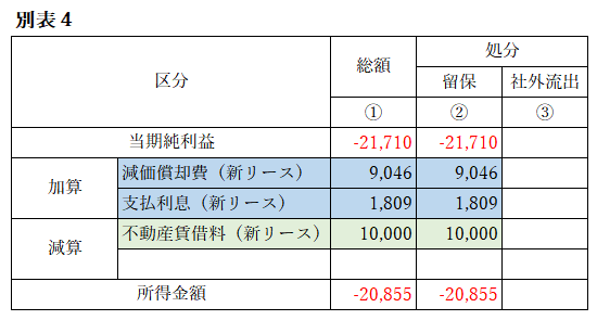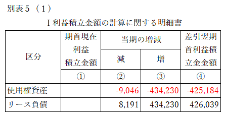 別表5(1) の差引翌期利益積立金は不動産賃貸借取引等として、貸借対照表に計上されている使用権資産、リース負債の残高と一致します。