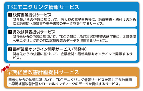 TKCモニタリング情報サービスは、TKCシステム利用企業からの依頼に基づいて、TKC会員(税理士・公認会計士)が決算書や月次試算表等のデータを金融機関に提供する無償のクラウドサービスである。TKCの会計事務所の指導をもとに作成される信頼性の高いデータであることから、金融機関は取引先企業の経営状況を正しく把握することができる。肥前観光ではこのサービスを利用して、決算書のほか、四半期ごとに月次試算表のデータを地元の銀行・信金に送ることもしている。
