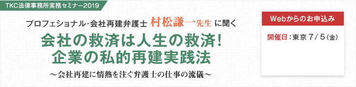そこで、今回、会社再建のプロフェショナルであり、多くの会社を救済してきた第一人者である村松謙一弁護士を講師にお迎えし、セミナーを開催します。会社再建弁護士としてのプロの仕事の流儀、具体的な私的再生の実践手法など、その深い思いとノウハウを村松先生のご経験を踏まえ、ご講演いただきます。