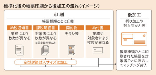 標準準拠にあたり、TKCではA4判サイズの通知書を採用する予定です。アウトソーシングサービスでは、作成した通知書と期別の納付書やお知らせなどの同封物を、対象者ごとにマッチングして封入封かんします。固定資産税の場合は、これに加えて対象者ごとに異なる枚数の課税明細書の封入も必要で、標準化対応に伴い作業の複雑化が予想されます(図)。