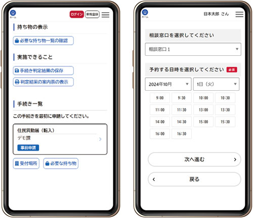 スマート申請システムの「手続き判定結果確認」(左)と「窓口予約」(右)
