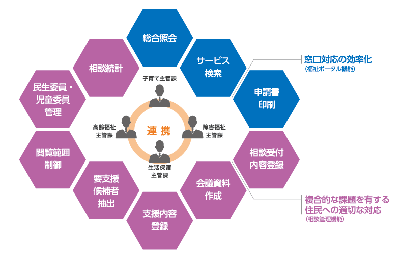 窓口業務の効率化を図る「福祉ポータル機能」と、複雑な課題を有する住民への適切な対応を支援する「相談管理機能」で構成されています。