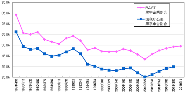 2019年の全産業の黒字企業割合は、前年の53.4%から0.7ポイント上昇して54.1%でした(10年連続の上昇)。