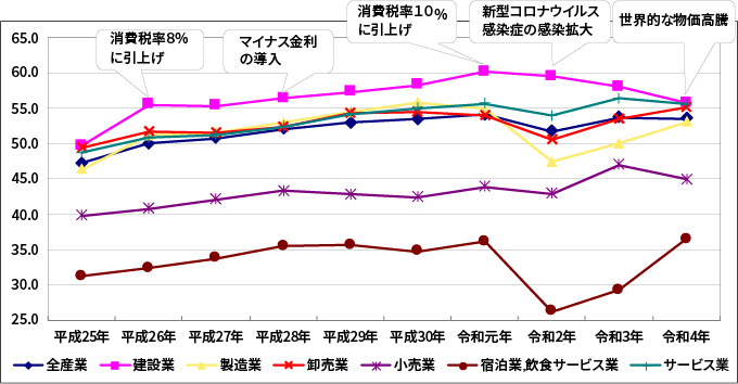 産業別に見ると、建設業の黒字企業割合がすべての産業で最も高いものの、前年の58.1%から2.3ポイント低下し、すべての産業の中で唯一、3年連続の低下となりました。また、黒字企業割合が最も上昇したのは宿泊業、飲食サービス業で、前年から7.1ポイント上昇し、コロナ禍前の水準に回復しました。