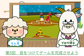 日曜日、外で野球をするのを楽しみにしていた羊のラム君でしたが、この日はあいにくの雨。がっかりしていたラム君に、プログ博士が代わりにプログラミングで野球ゲームを作って遊ぶことを提案します。初心者向けのプログラミングソフト「スクラッチ」の使い方について野球ゲームの制作を通して全5話で学んでいきます。