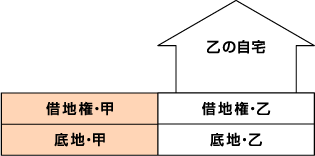 - 甲の土地には、乙の借地権が設定されている。 この場合、甲が所有する底地部分の相続税評価額は、「自用地評価額×(1 - 借地権割合)」とされるが、換金化しようとしても相続税評価額以上では売却することができない。