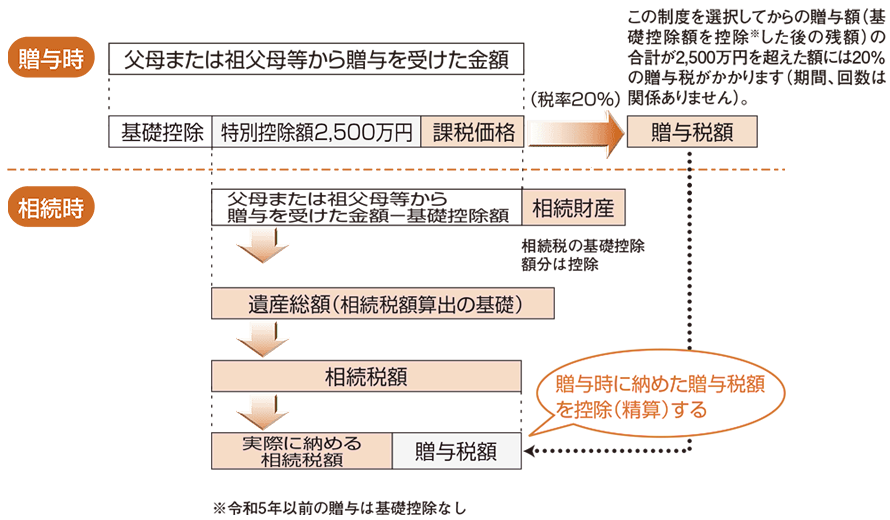 - 贈与を受けたときに、贈与財産に対する定率の贈与税を支払います。その後贈与者が亡くなったときに、相続財産にその贈与財産(贈与時の価額)のうち、基礎控除額を控除※した残額を加えて相続税額を計算し、すでに支払った贈与税額を控除します。