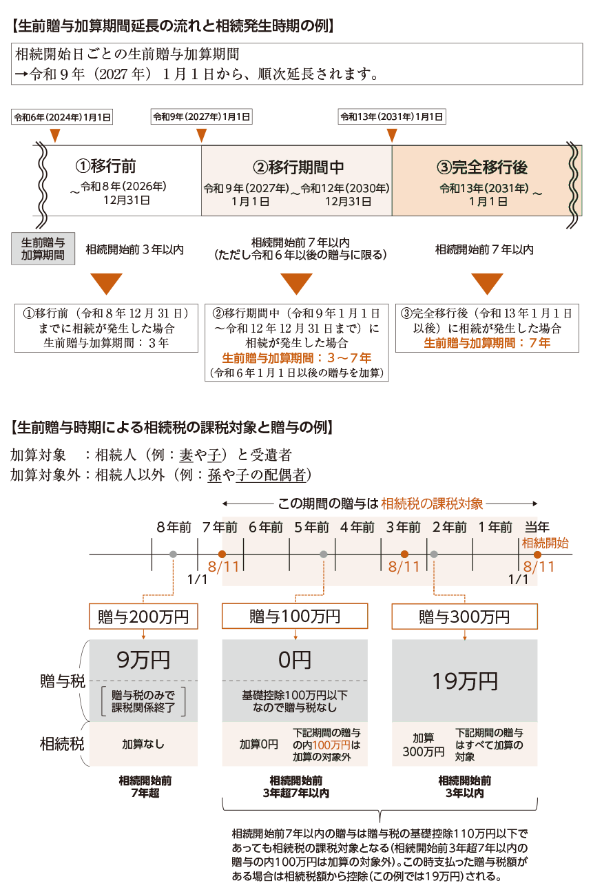 令和6年以後の贈与が7年分加算の対象となり、令和9年以後に発生する相続で、加算される期間が順次延長されていきます。なお、延長された4年間に受けた贈与については、総額 100 万円までは相続財産に加算されません。