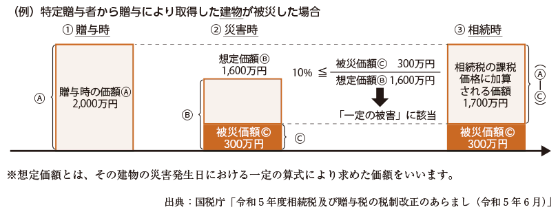 ですが、相続時精算課税制度を選択して贈与を受けた土地・建物が、その贈与者の死亡に係る相続税の期限内申告書の提出期限までの間に災害で一定の被害を受けた場合、相続時にその土地・建物の評価を再計算(その災害によって被害を受けた部分に対応する金額を控除)することができます。