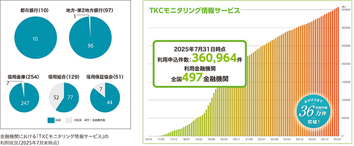TKCモニタリング情報サービスの開始は2016年10月。いまや対応する金融機関の数は497機関を超えるまでに増えており、メガバンク全行をはじめ、地銀・第二地銀、信用金庫の9割超で融資判断に活用されています。それらの金融機関の中には、当サービスの利用企業を対象に、金利を優遇したり、短期継続融資の提供あるいは経営者保証を免除するなど、独自の融資商品を開発しているところもあります。また、全国51の信用保証協会のうち、44協会が当サービスを利用しています。